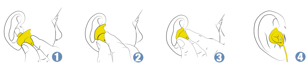 Pour la mise en place, veuillez insérer la partie percée dans le conduit auditif et le crochet dans l’hélix. (La bille rouge repère le bouchon de l’oreille droite). Vous pouvez utiliser la gamme hygiène pour faciliter les premières insertions des EPI. ( Ce n’est pas nécessaires si vous avez choisi l’option peau de pêche).